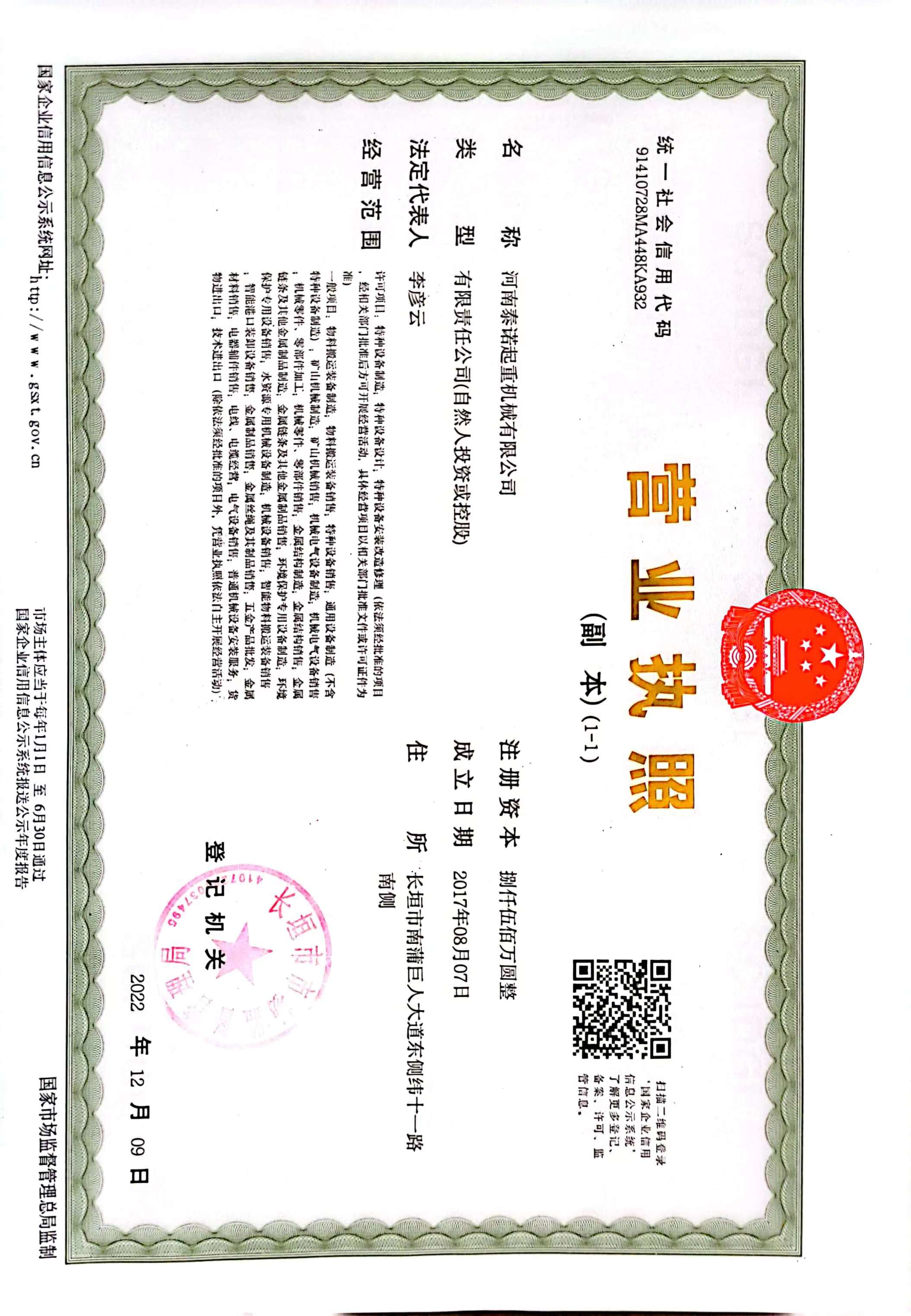 特种设备生产许可证