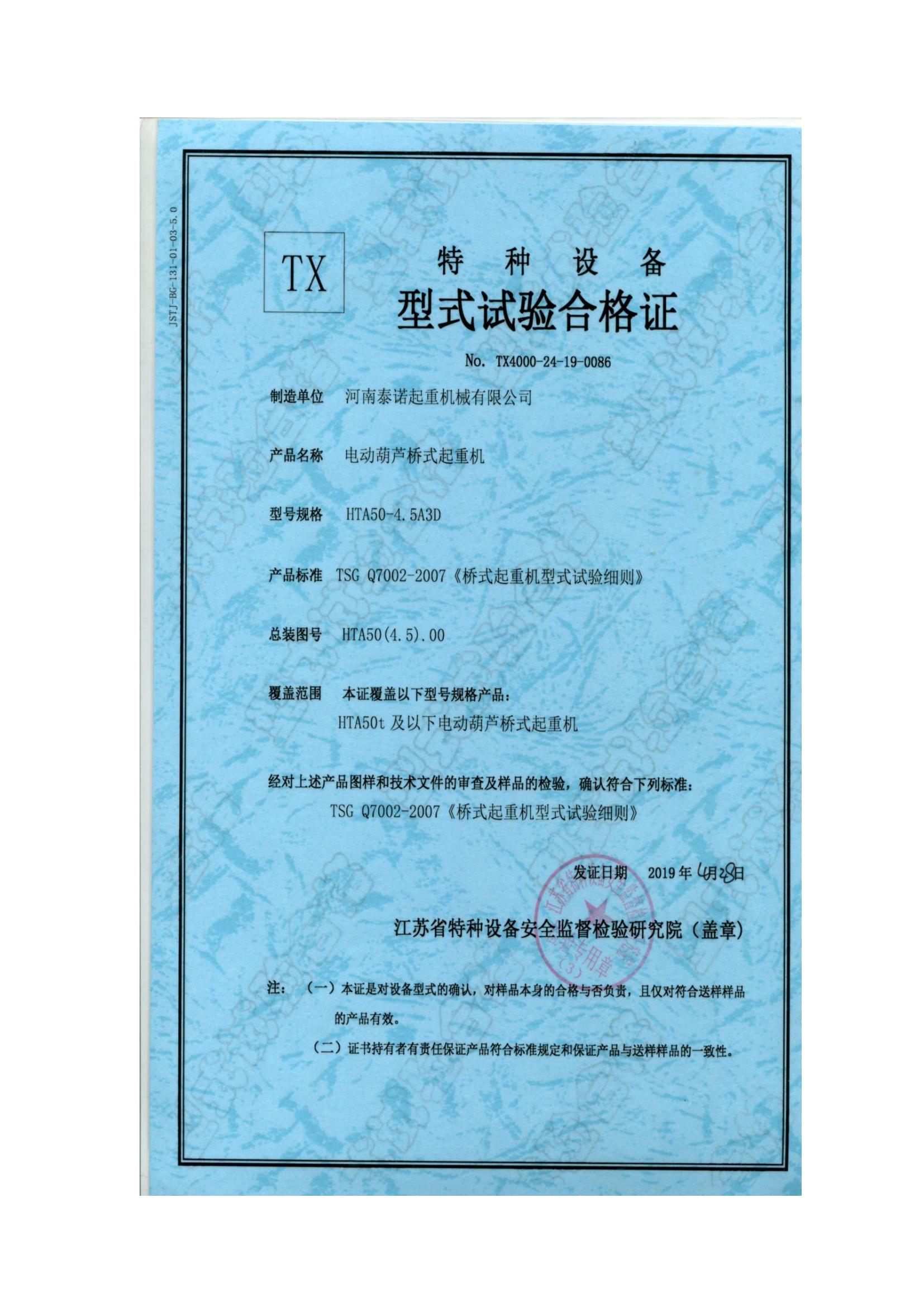 特种设备型式试验证书(起重机械)