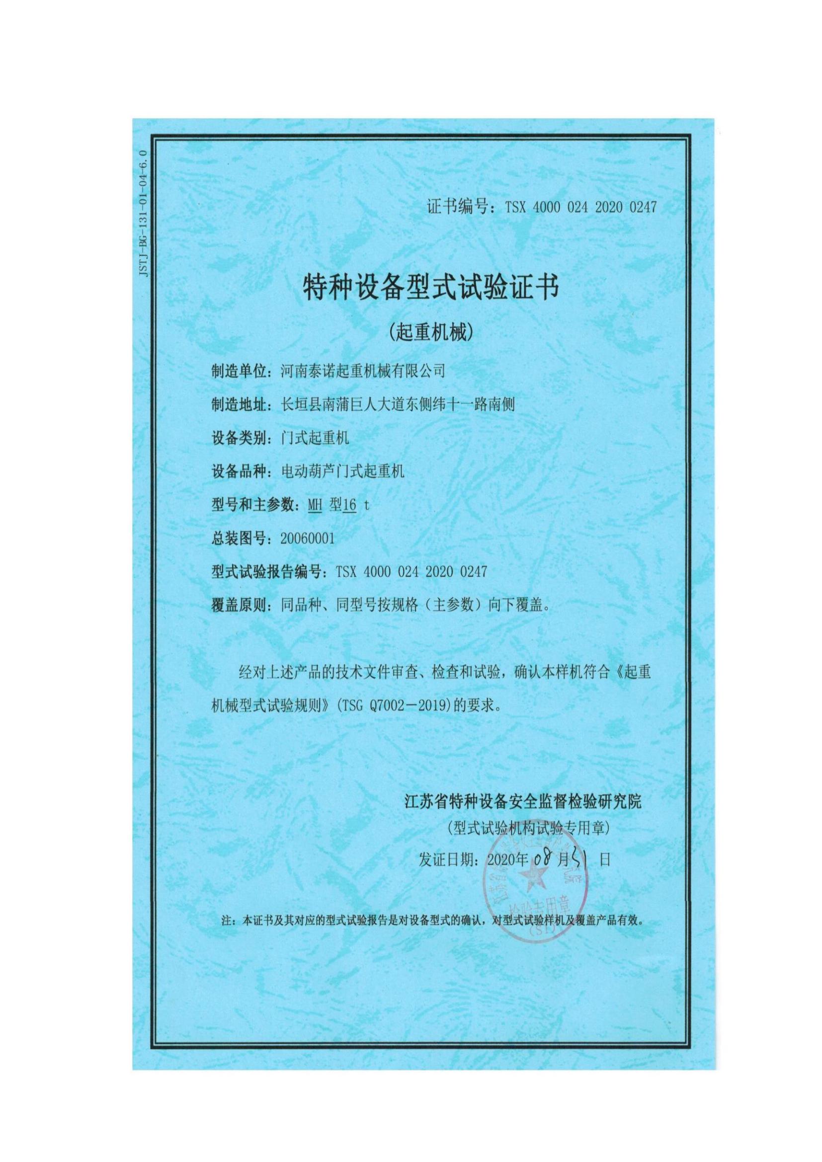 特种设备型式试验证书(起重机械)